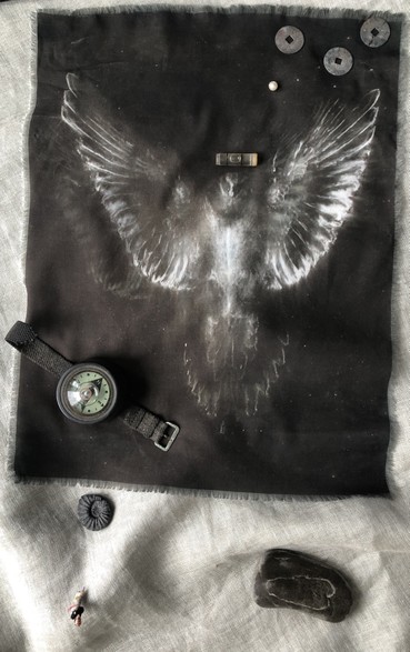 The background image is called flight interrupted. This is path to and through the threshold at the spirit/ matter divide. The symbols that line the paths, provide the space for an evolving journey. They each hold an "idea" where you’re imagining can embark. Ask for help at each stop. Use the power of words to form your intent.